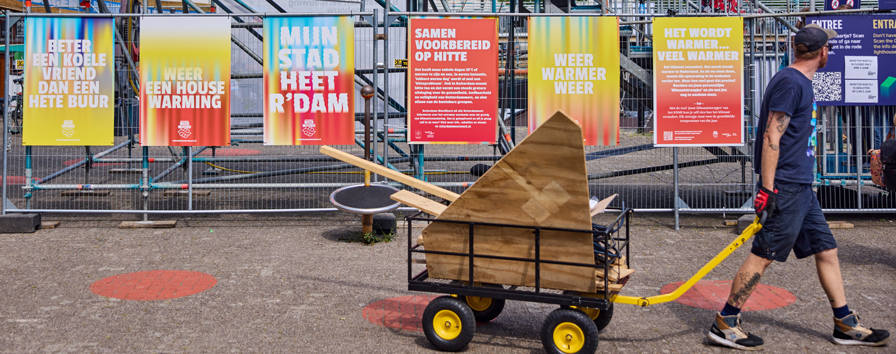 Op zomerse dagen is het in de stad gemiddeld 8 graden warmer geworden. Zomerweer is fijn, maar vanaf 25 graden wordt het voor veel mensen al snel te warm. Boven de 30 graden krijgen de meeste mensen klachten, vooral als het ’s nachts niet afkoelt. Op basis van het wijkhitteplan ‘Hitte Wijkt Niet’ van de Gemeente Rotterdam en de GGD ontwikkelden wij een serie verdiepende posters waarmee wij inzoomen op specifieke thema’s. De gehele reeks was zichtbaar bij het Maritiem Museum tijdens de Rotterdamse Dakendagen.