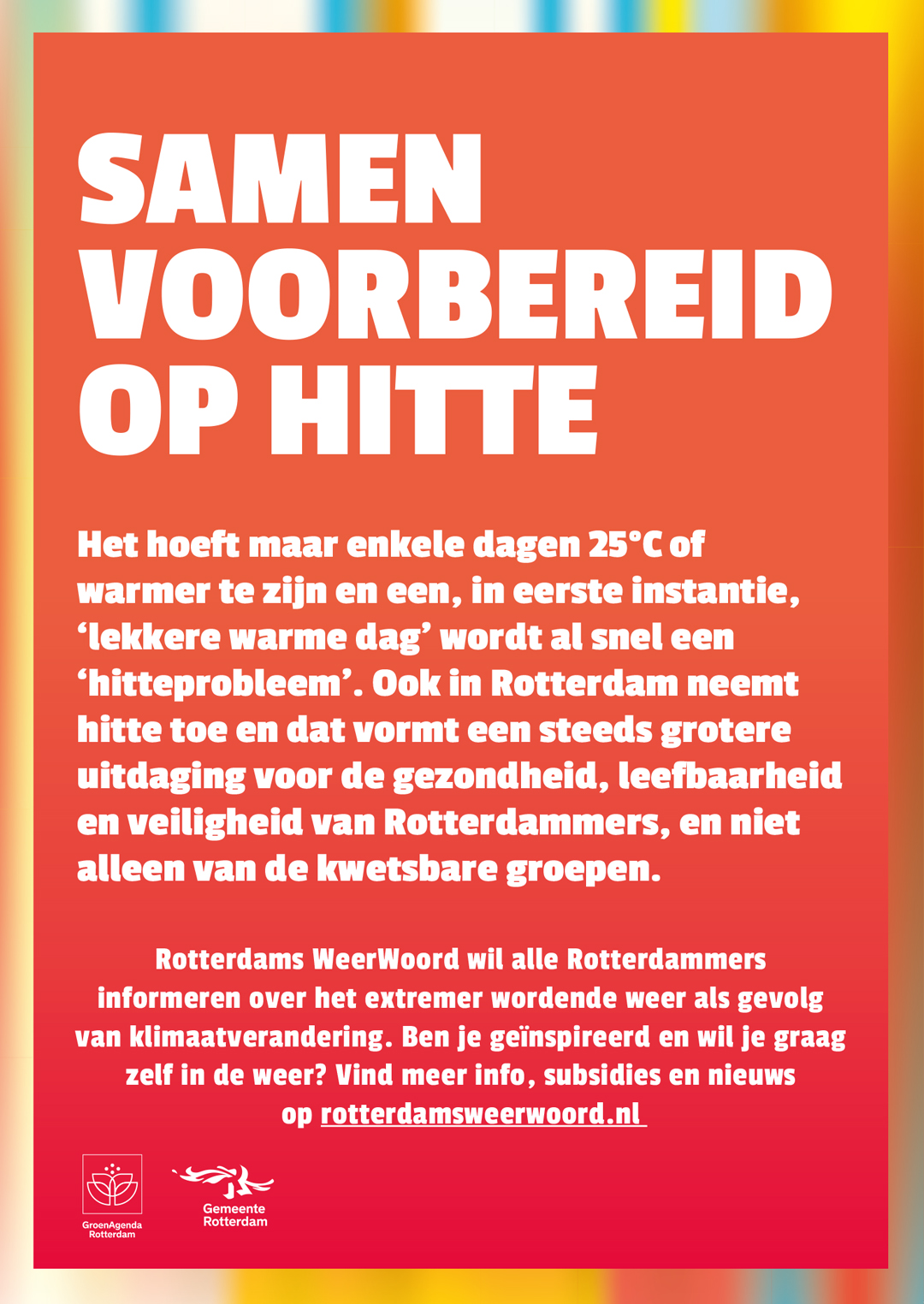 Veel mensen weten nog niet goed wat de risico’s van hitte zijn, of wat je kunt doen om je te beschermen. Daarom is op 2 juni 2025 de eerste Heat Action Day Rotterdam georganiseerd. Een dag waarop de gevolgen van hitte onder de aandacht gebracht worden. Zo wordt iedereen beter voorbereid op de komende warme zomers. Het Rotterdams WeerWoord heeft Things To Make And Do gevraagd een visueel concept rondom het thema ‘hitte’ te ontwikkelen.