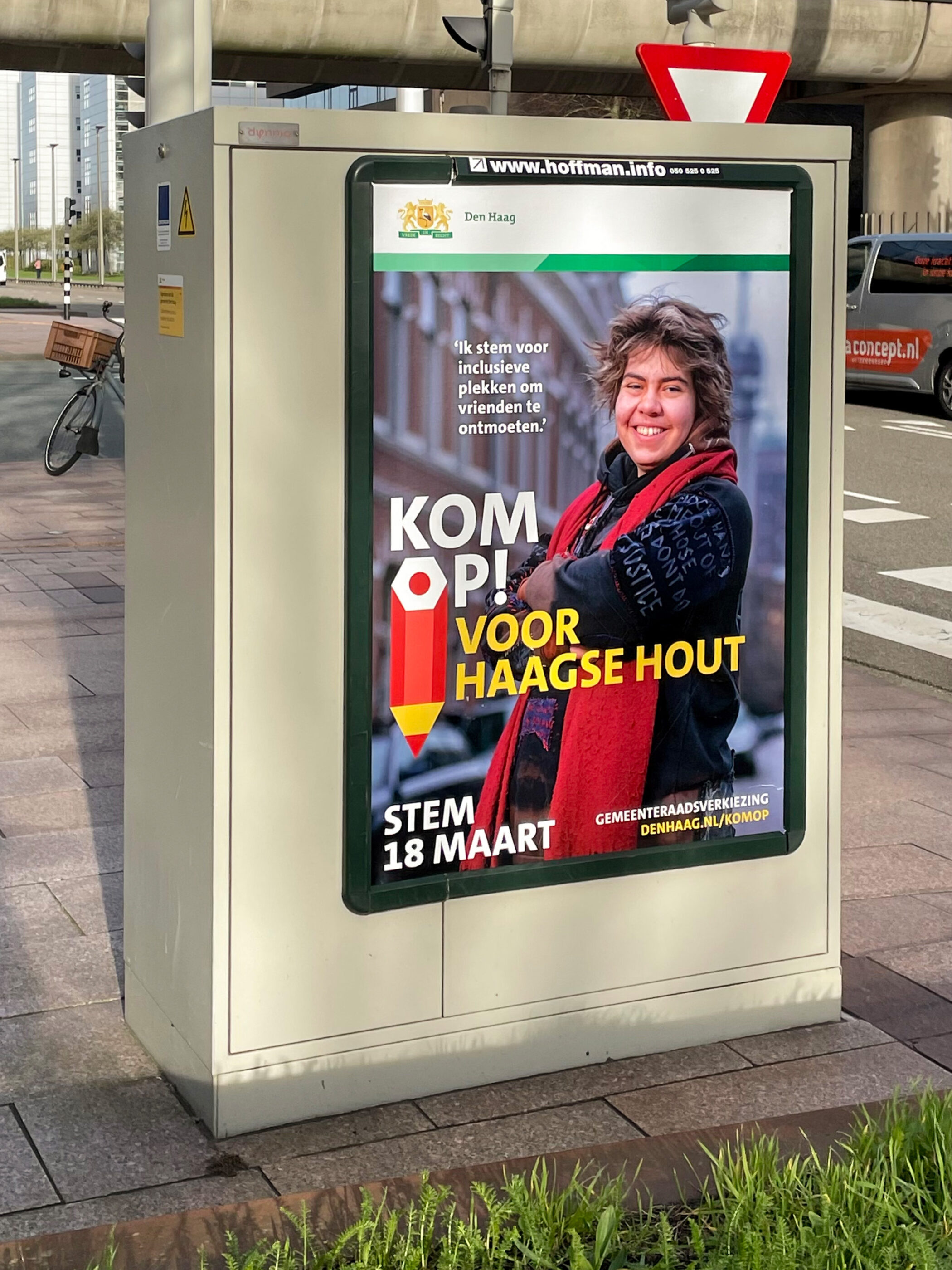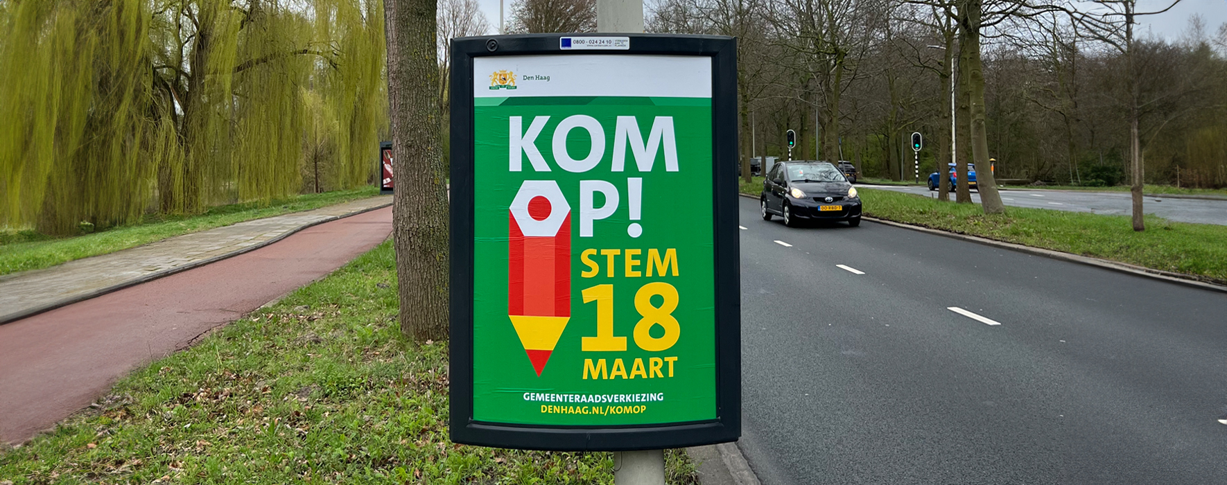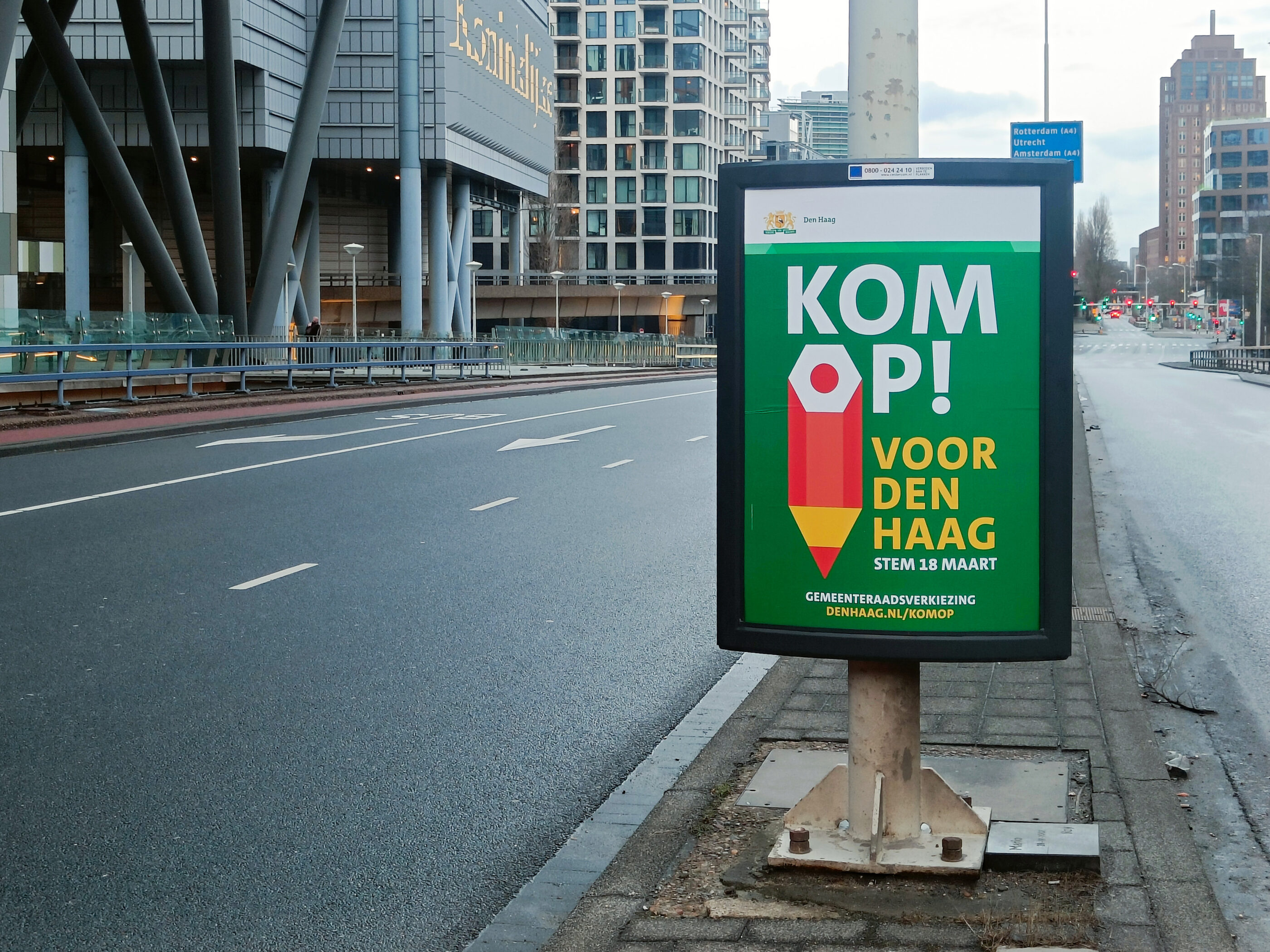 In de hele stad was de campagne zichtbaar met de herkenbare boodschap ‘Kom op! voor Den Haag’, dat uitdaagt om op te komen voor jouw stad. Tekstueel verbinden we hier op een eenvoudige en slimme manier activatie met het belang van een hogere opkomst. We creëerden een campagnestijl waar inwoners van Den Haag niet omheen konden, met heldere Haagse kleuren en krachtige grafische stijlelementen. Ook praktische informatie over waar, wanneer en hoe je kunt stemmen was onderdeel van de uitingen.