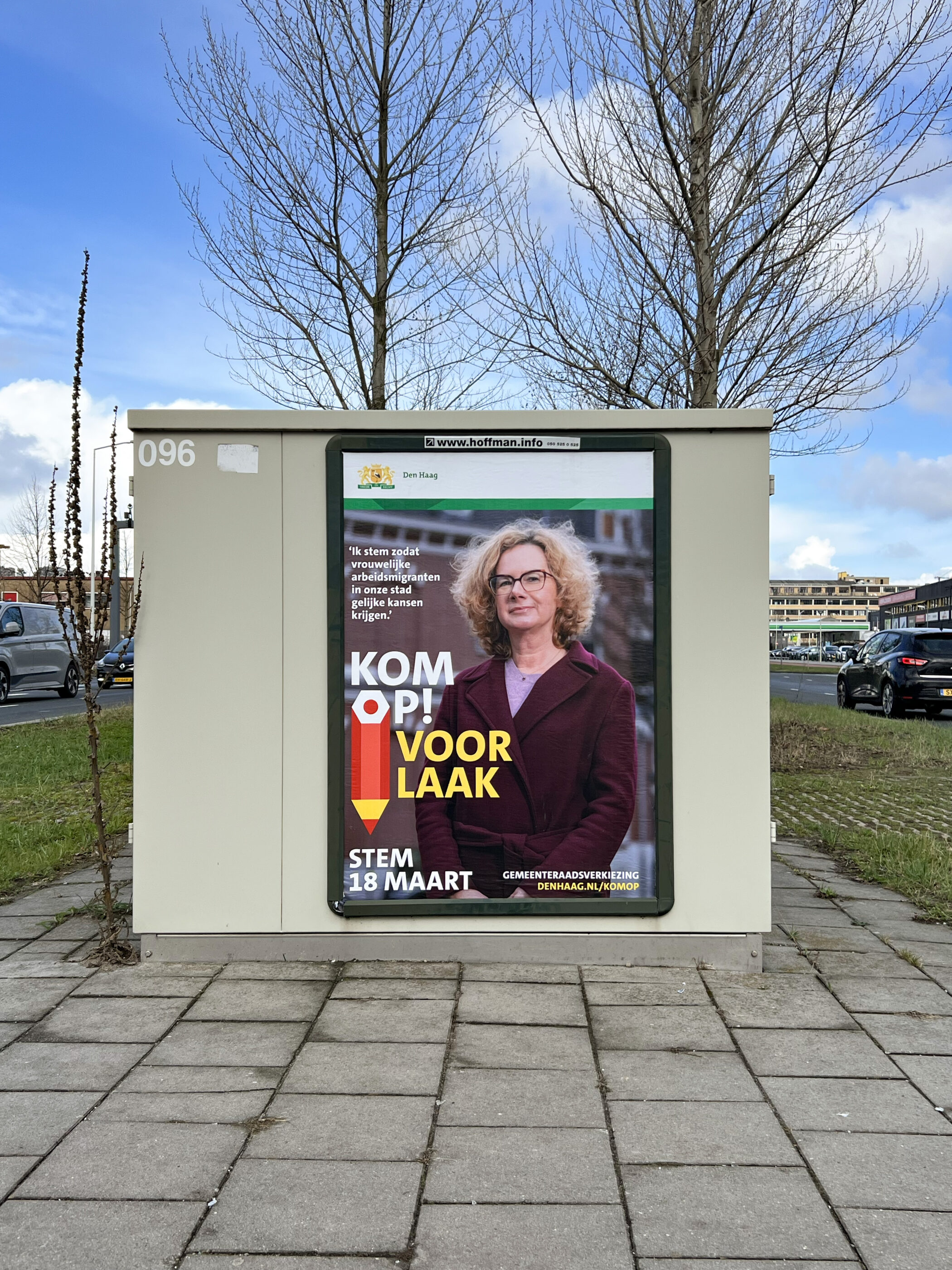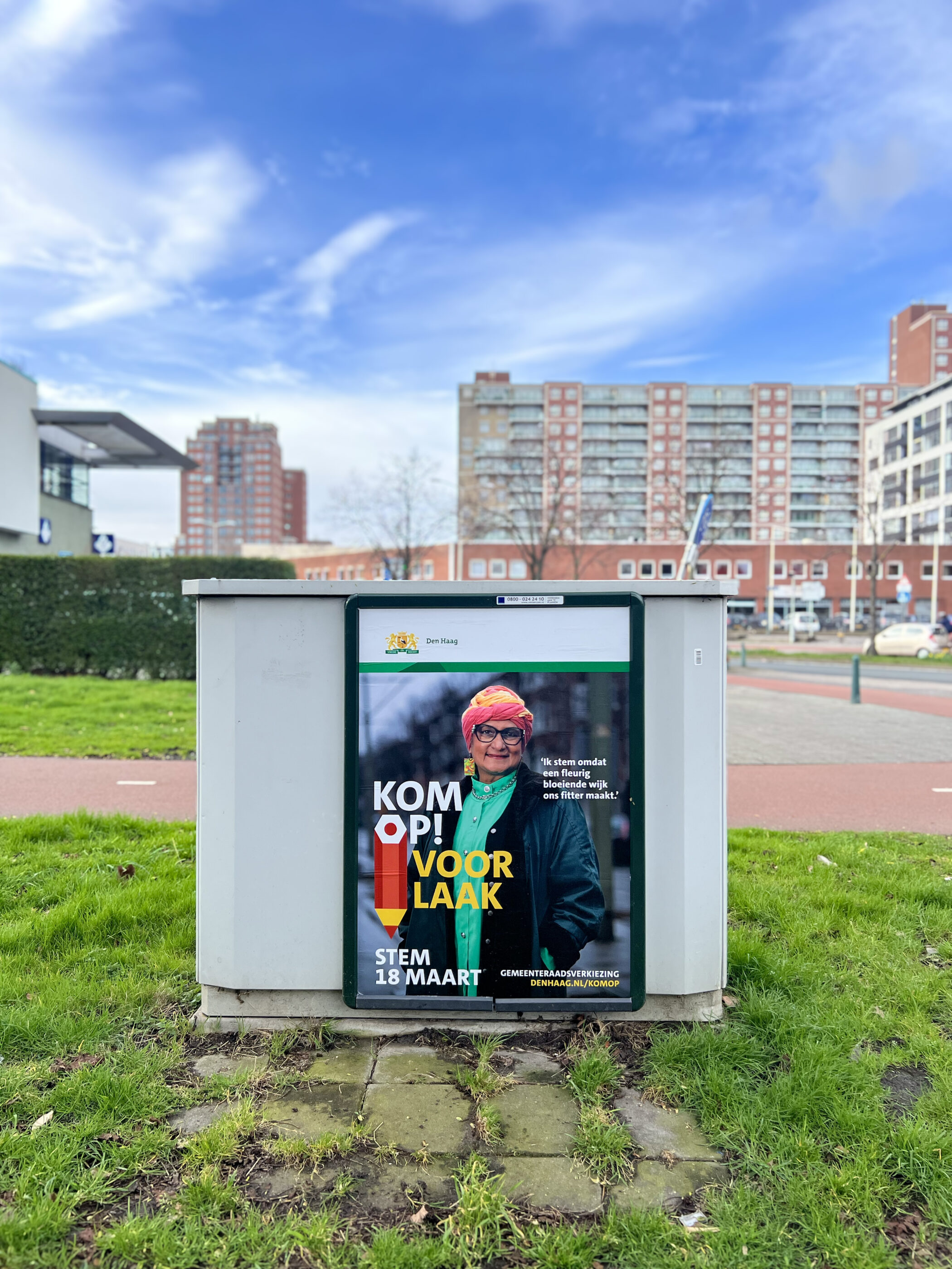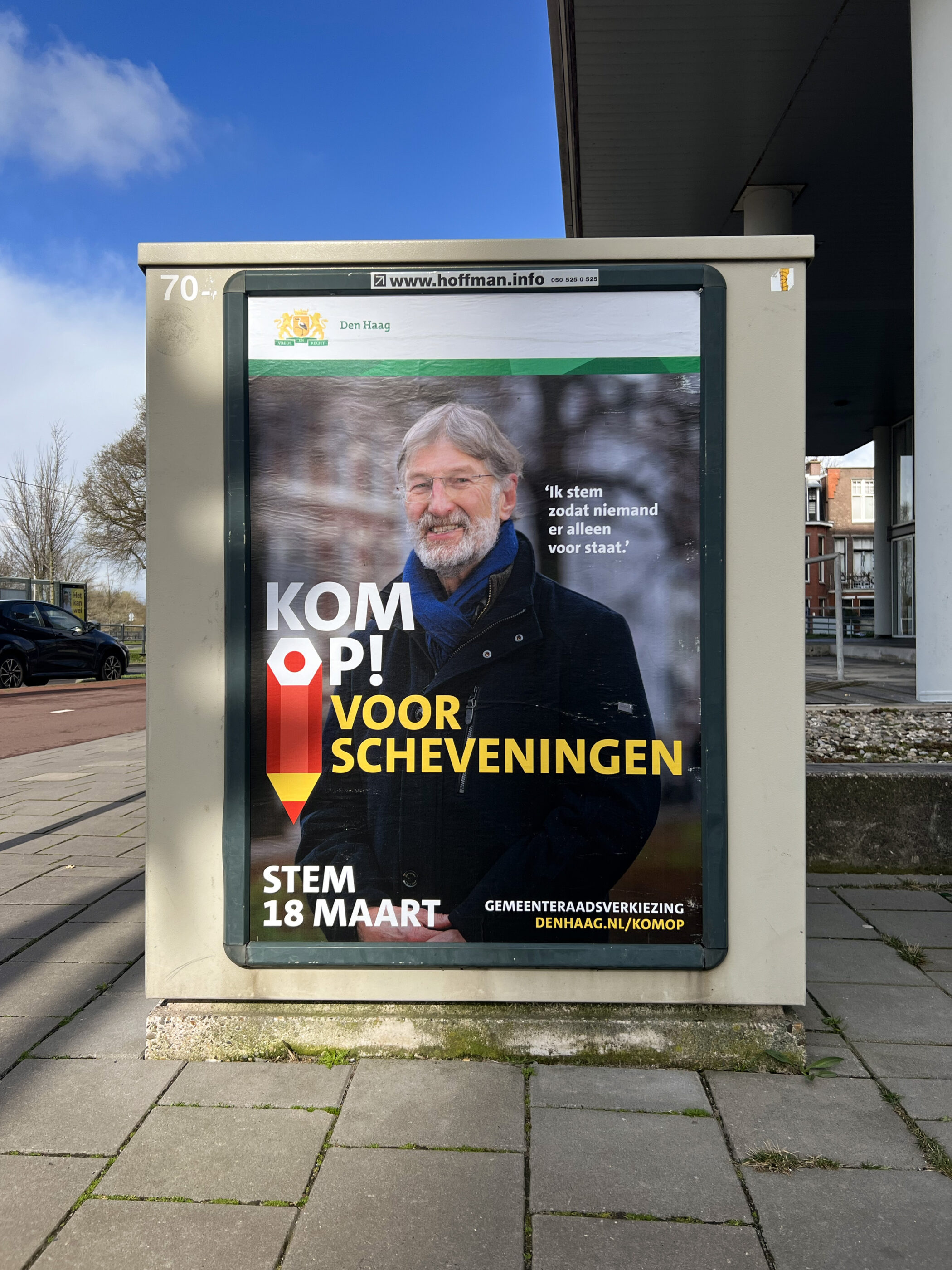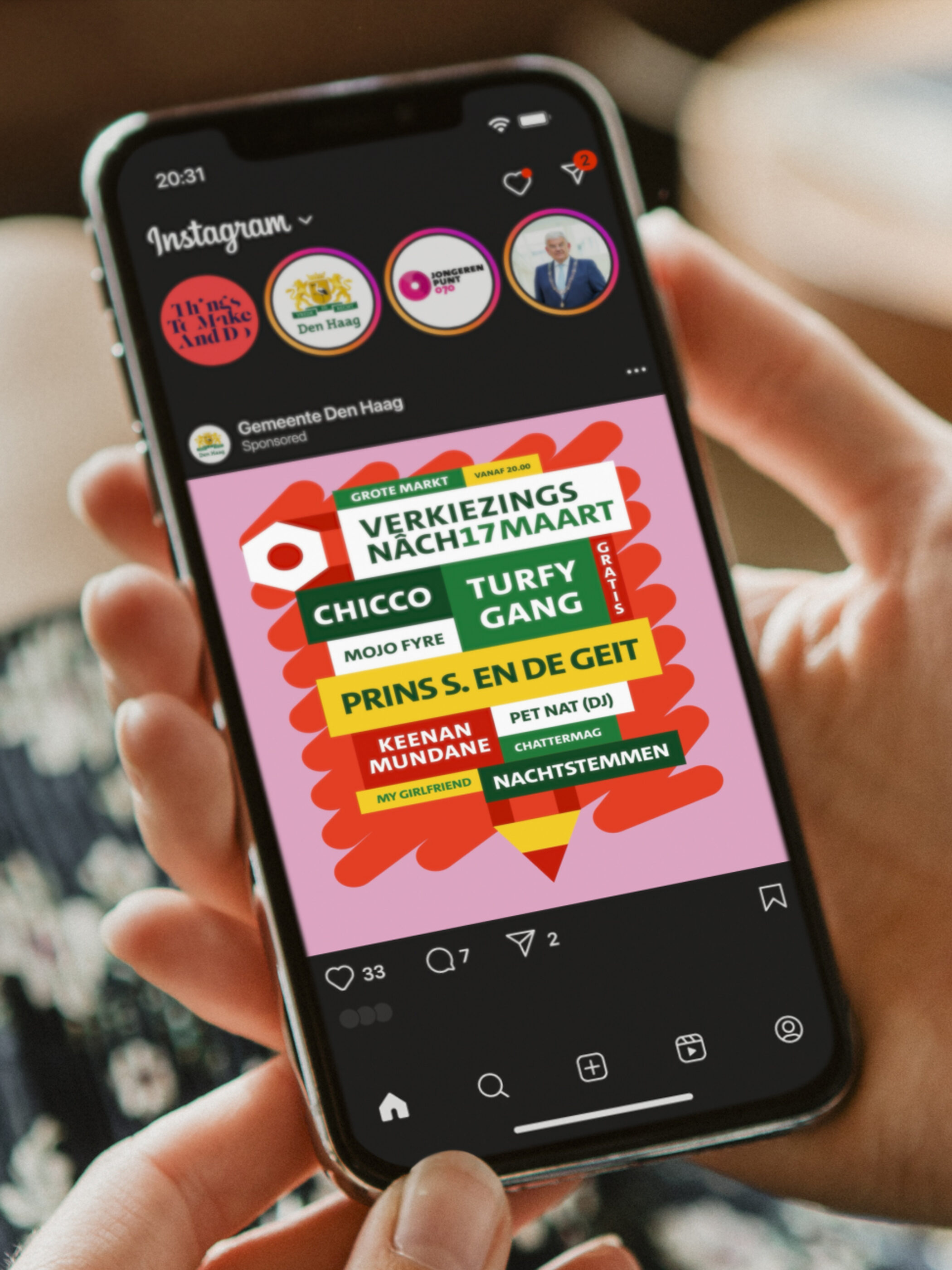 In de hele stad was de campagne zichtbaar met de herkenbare boodschap ‘Kom op! voor Den Haag’, dat uitdaagt om op te komen voor jouw stad. Tekstueel verbinden we hier op een eenvoudige en slimme manier activatie met het belang van een hogere opkomst. We creëerden een campagnestijl waar inwoners van Den Haag niet omheen konden, met heldere Haagse kleuren en krachtige grafische stijlelementen. Ook praktische informatie over waar, wanneer en hoe je kunt stemmen was onderdeel van de uitingen.