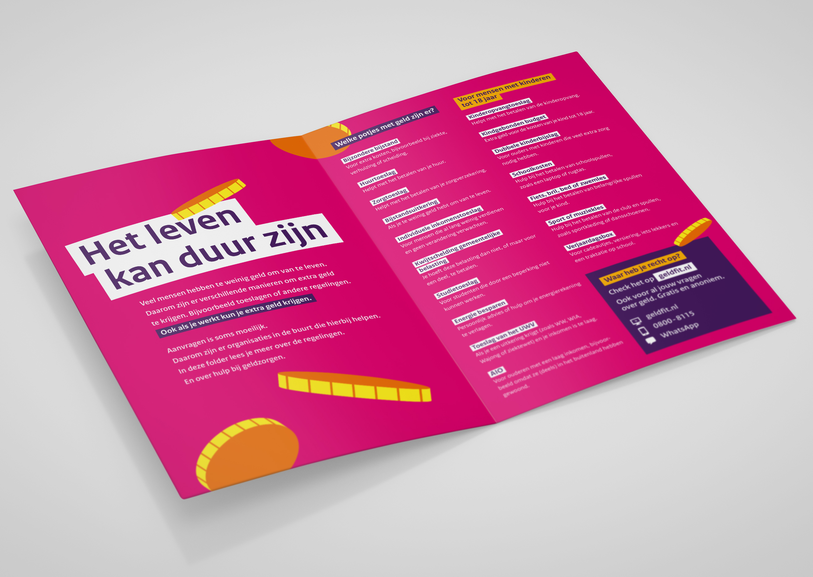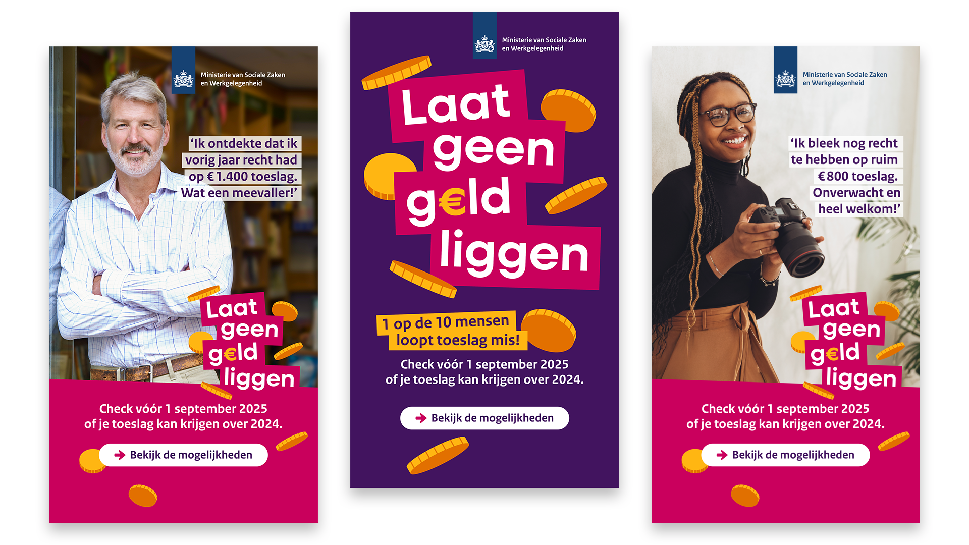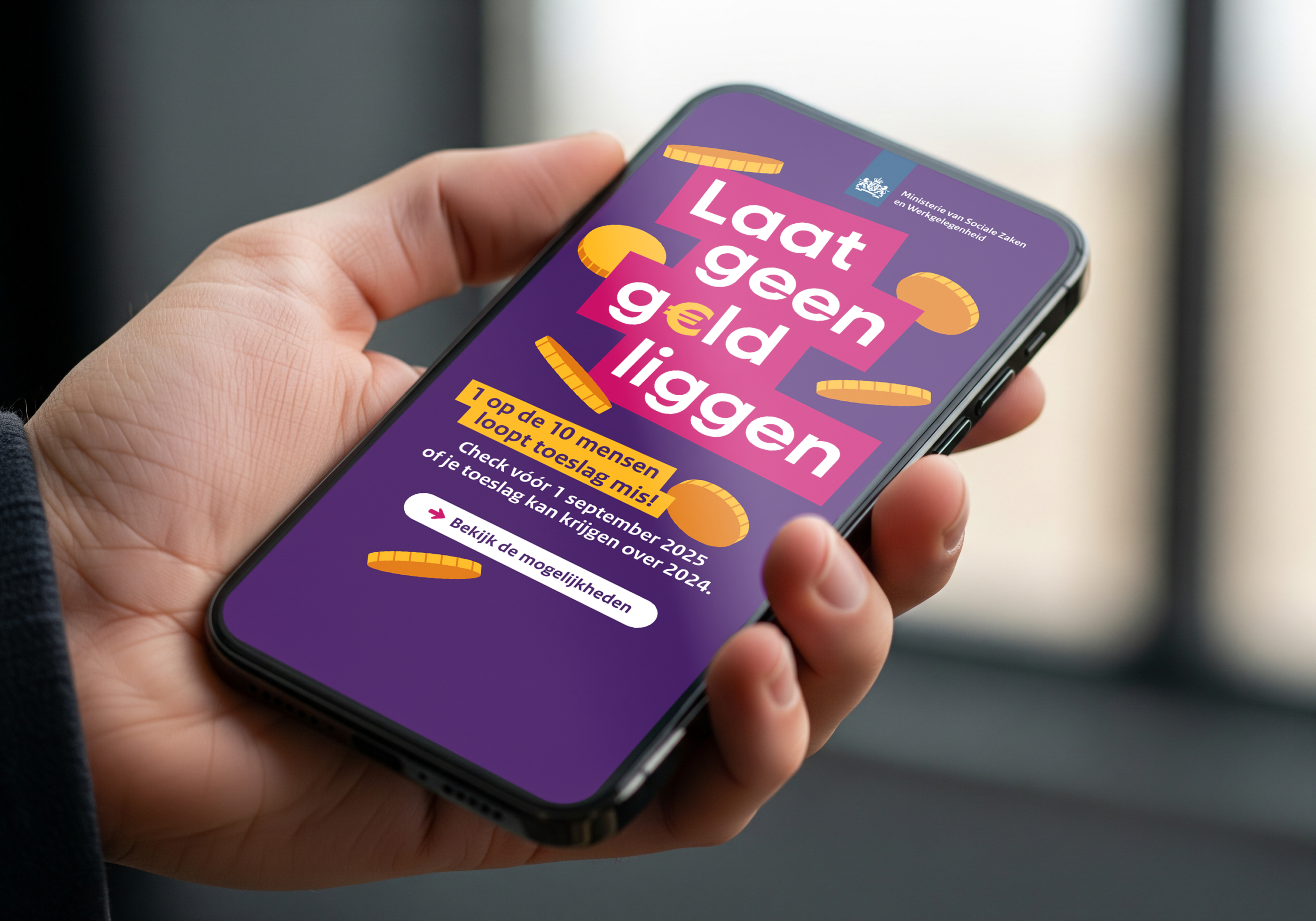 Voor het ministerie van Sociale Zaken en Werkgelegenheid ontwikkelden we de campagne ‘Laat geen geld liggen’, gericht op werkenden met een laag of wisselend inkomen. Veel mensen hebben recht op toeslagen of andere inkomensregelingen, maar maken daar geen gebruik van. Niet omdat ze er geen recht op hebben, maar omdat ze het niet weten, het ingewikkeld vinden of bang zijn dat ze later geld moeten terugbetalen.